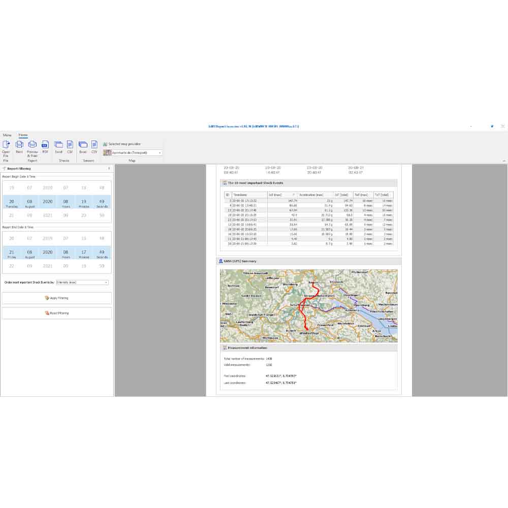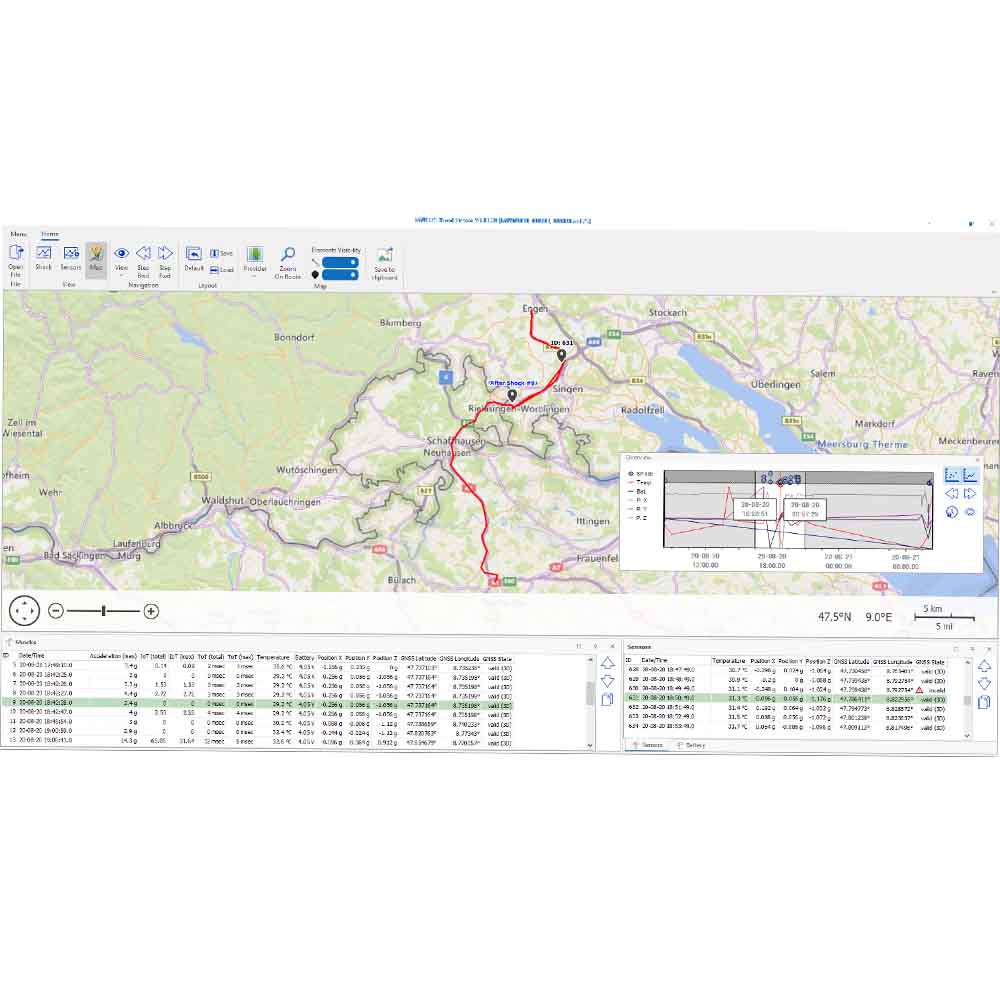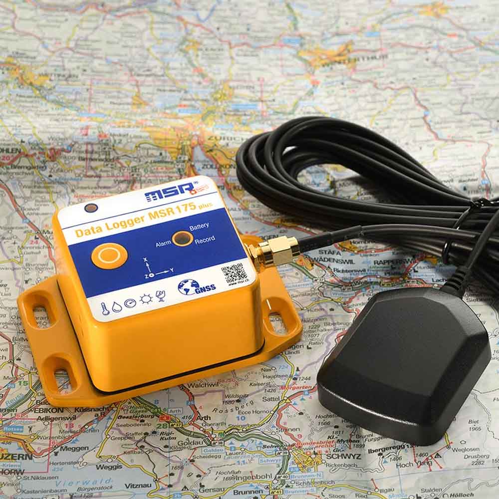 I tillegg overvåker MSR 175plus temperatur, relativ fuktighet, lufttrykk og lys, noe som gir full innsikt i transportmiljøet. Alle måledata kan knyttes direkte til geografisk posisjon og tidspunkt ved hjelp av innebygd GPS/GNSS-mottaker, slik at man nøyaktig kan fastslå hvor og når et avvik oppstod.