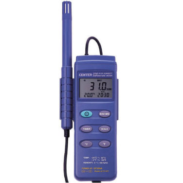 Center 310 luftfuktighetsmåler kommer med ekstern sensor som måler luftfuktighet fra 0 til 100% RH. Den måler lufttemperatur fra -20 til 60 °C. Hygrometeret har holdefunksjon og lagrer maksimum og minimum luftfuktighets punkter. For luftfuktighet er nøyaktigheten på ±2,5% RH og for temperatur er nøyaktigheten på ±0,7°C.
