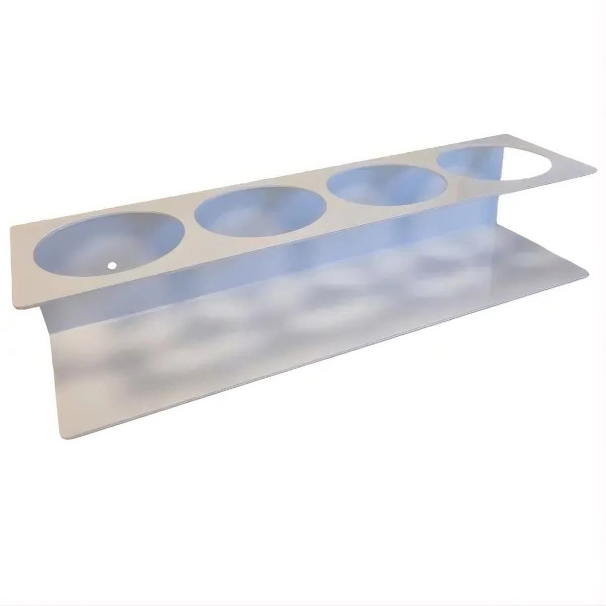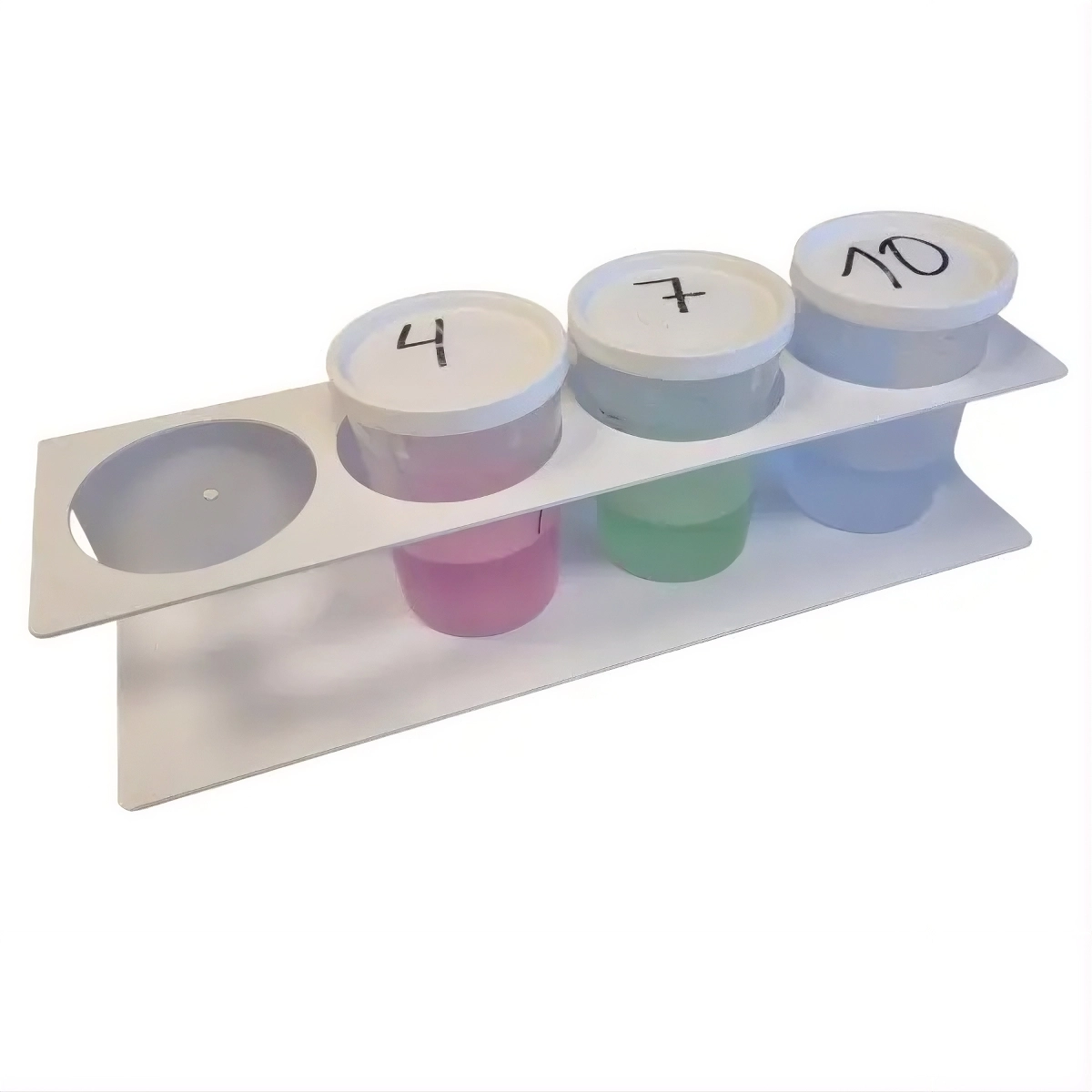 Stativet gjør kalibreringen og oppbevaring av kalibreringsvæsken enklere. Plastbegrene følger ikke med i leveransen. Stativet har 2 stk 5 mm diameter hull for veggmontering.