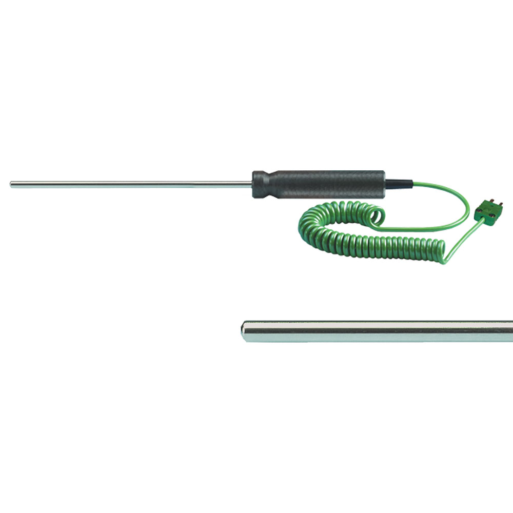 Robust og allsidig dyppeføler med 3 mm mineralsk isolert målespiss og 300 mm stammelengde. Føleren er utstyrt med et ergonomisk håndtak (tåler opptil 105 °C), 1 meters spiralkabel og fast miniatyr flatstiftplugg for enkel tilkobling til håndholdte indikatorer eller annet kompatibelt utstyr. Ideell for nøyaktig temperaturmåling i krevende prosesser og laboratoriebruk.
