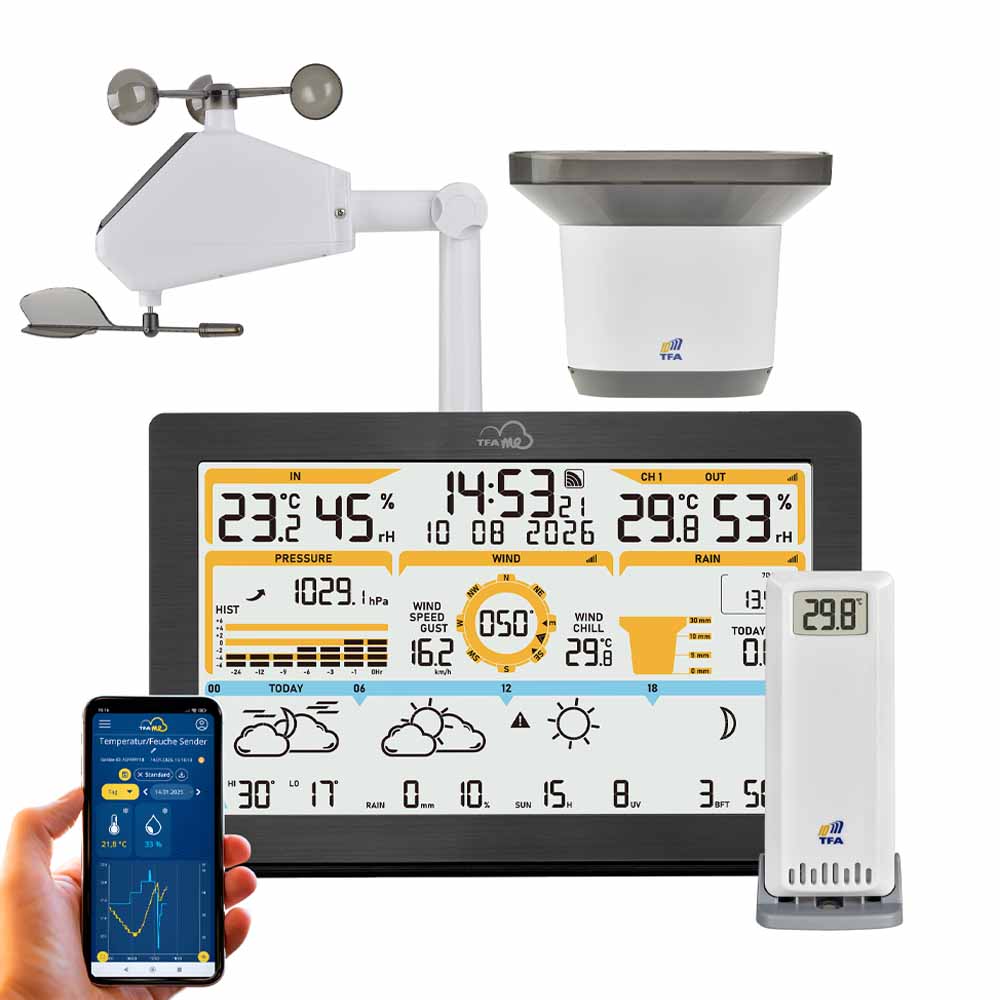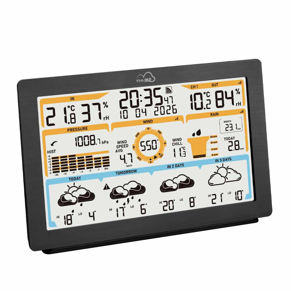 TFA 35.8106 er en avansert og komplett WiFi-værstasjon som kombinerer profesjonelle værprognoser med presise lokale målinger. Værstasjonen mottar oppdaterte 4-dagers værvarsler direkte fra den anerkjente værtjenesten wetter.com, levert via trådløst nettverk – helt uten abonnement, reklame eller skjulte kostnader.