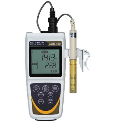 Eutech CON 150 konduktivitetsmåler er en vanntett (IP67) ledningsevne, TDS og temperaturmåler. Måleområde for konduktivitet er fra 0 til 200 mS/cm. Instrumentet måler TDS fra 0 til 200 ppt og temperatur fra -10,0 til 110,0 °C. Instrumentet har opplyst display, mulighet for å lagre 150 målinger med tidspunkt for målingene.